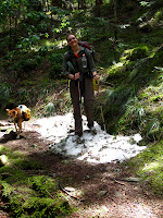 After lunch we started seeing patches of snow; "how novel," we though to ourselves and even took a few pictures of us standing in the snow on the side of the trail. Boy did we not know what was in-store for us! Soon the trail was covered in snow and we can honestly say that all three of us are no longer posthole virgins. (Post-holing is when you break through the surface of the snow and sink to the ground below, sometimes waist deep). Gabi almost lost her shoe and again thank goodness for Cinders handle as she post-holed and had to be plucked out of her quandary. Hiking in snow is difficult and tiring, "boy I hope we don't have to do a lot of this!"...